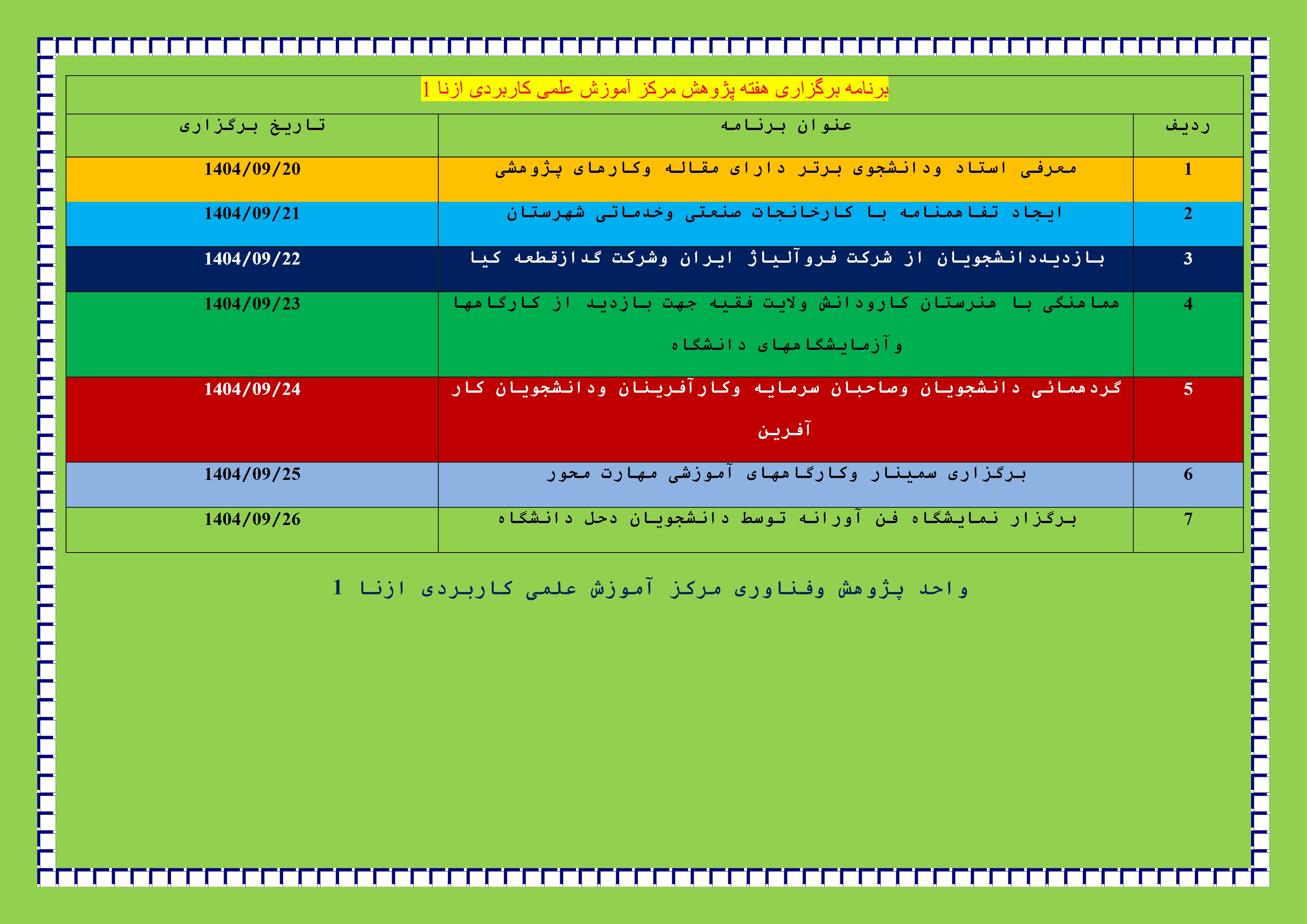 بمناسبت هفته پژوهش وفناوری مرکز آموزش علمی - کاربردی ازنا 1 -اقدام به برگزاری همایش وراه اندازی نمایشگاه در این دانشگاه نموده است .
