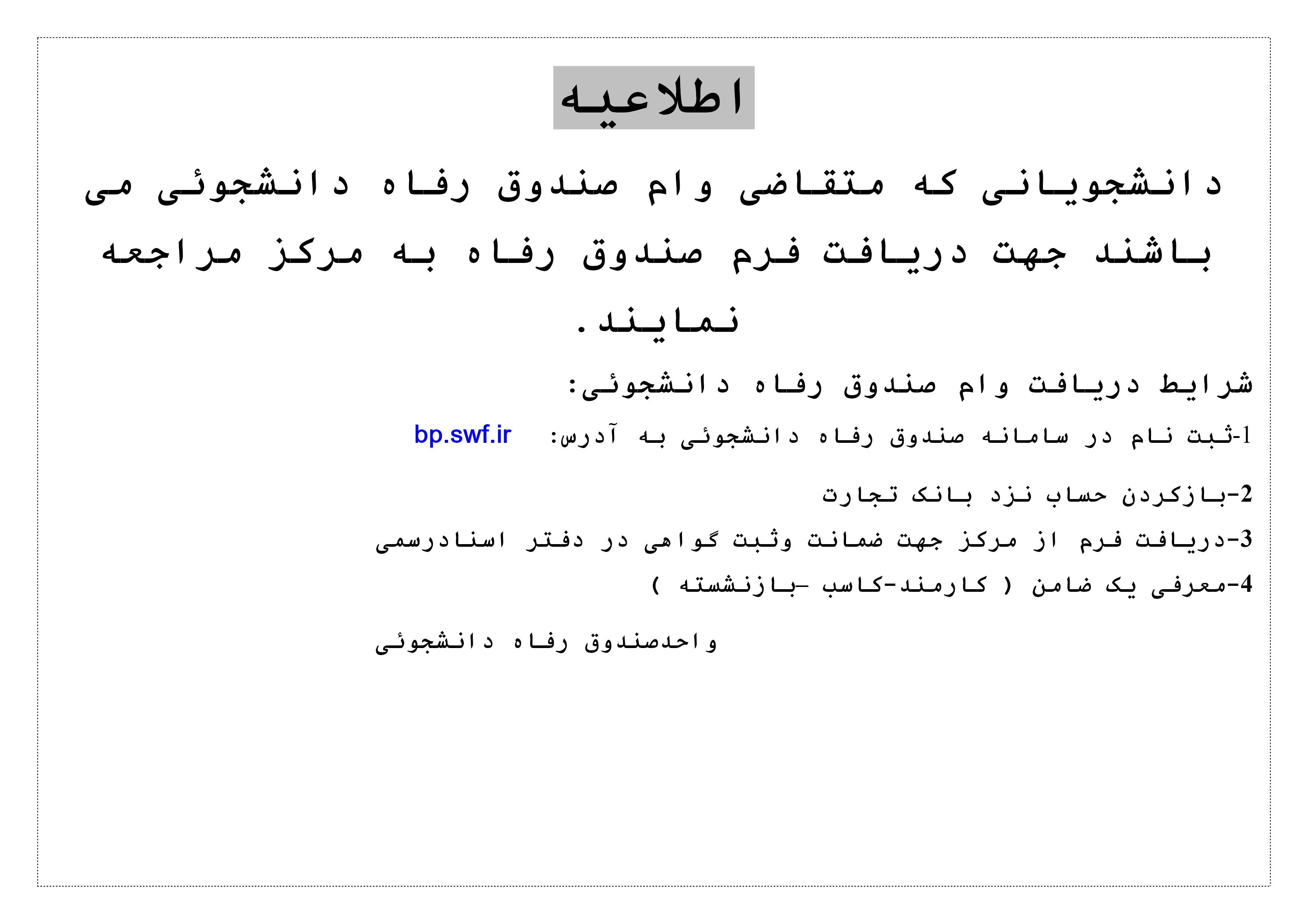 متقاضیان وام صندوق رفاه دانشجوئی می توانند از هم اکنون نسبت به تهیه وثبت مدارک خود در سامانه صندوق رفاه اقدام نمایند