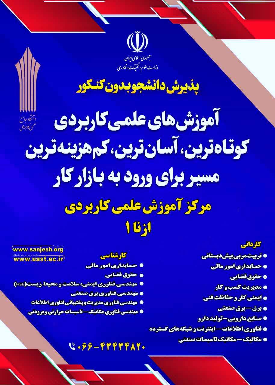 اطلاعیه اعلام تغییر زمان ثبتنام و انتخاب رشته در مرحله تكمیل ظرفیت پذیرش دوره كاردانی فنی و كاردانی حرفه ای ناپیوسته دانشگاه جامع علمی ـكاربردی بهمن ماه سال 1403